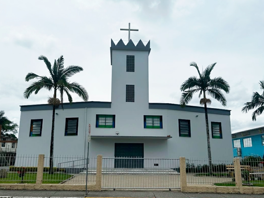 A primeira missa foi celebrada na escola Aníbal de Barba, sita à Rua Wenceslau Borini, nº 2210, pelo Pe. Henrique Kestring, pároco da Catedral. Por mais de um ano, as missas foram celebradas naquele local. Como altar servia uma mesa do Sr. Hermínio e, para sentar, os bancos da escola. Na ocasião, foram indicados como Ministros Extraordinários da Comunhão o Sr. Romão Fidelis e o Sr. Osmar Garcia. Pe. Henrique procurou formar uma diretoria para dirigir os trabalhos de formação da comunidade, mas houve dificuldades para completar a diretoria. Então, o Sr. Hermínio de Barba e o Sr. Sady Medeiros assumiram a coordenação dos trabalhos para iniciar a construção de uma igreja.