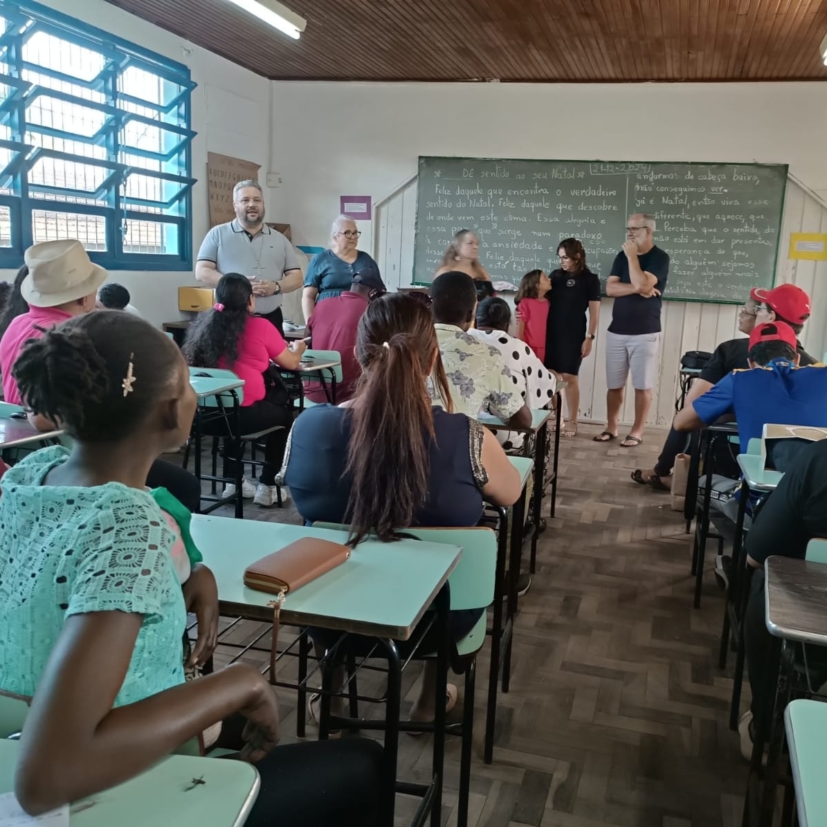 Antes dos eventos natalinos, Dom Adalberto fez um animado e descontraído diálogo com os 50 alunos da aula de português da prof. Elizabeth sobre o tema: "O que me aconteceu de bom neste ano de 2024?".