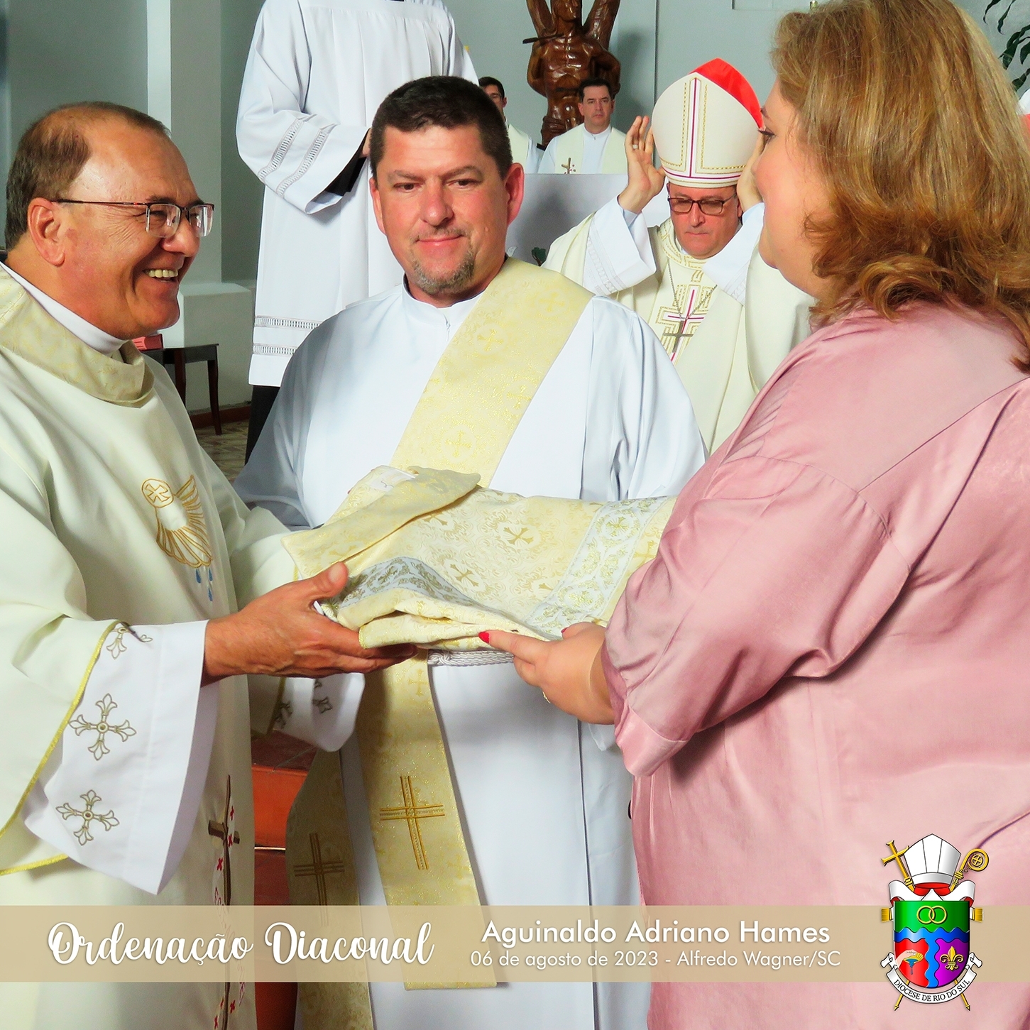 Na presença de sua esposa Fabrícia, seus filhos, família, amigos e comunidade, Aguinaldo recebeu o primeiro grau da Ordem, se tornando Diácono Permanente da Igreja.